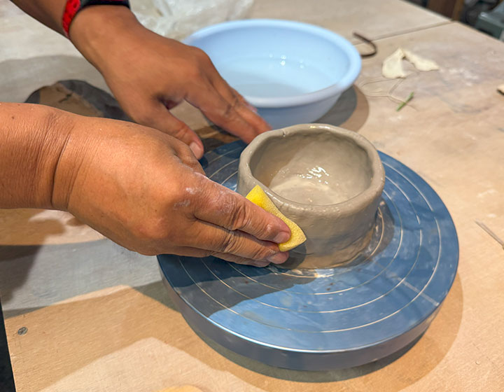 Once you have achieved a certain shape, it is time to use the hand-turned pottery wheel.