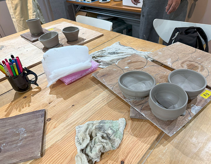 After greeting the instructors, the pottery workshop begins. First, we write the date and our names on the name cards we are given.