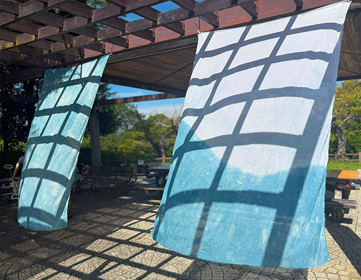 • 広場の側の藤棚では、草木染の布を展示。風を受けて気持ちよさそう。