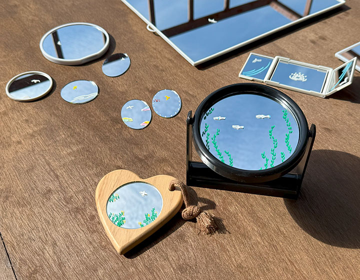 体験は、沢山の鏡の中から好きなものを選び、マーカーペンで好きなものを描き、空を映して写真を撮るという内容。