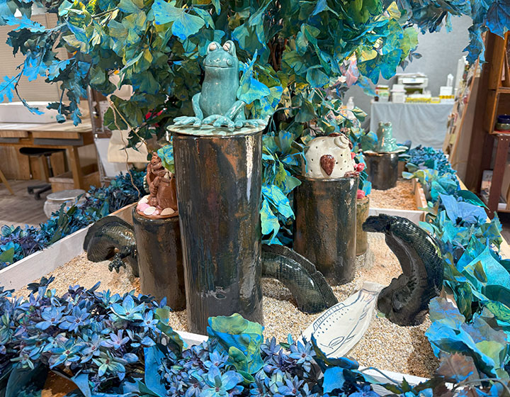 言葉の通り、雲ひとつない明るい空のような青色に染められた草花と、陶芸家の先生や生徒さんたちの作品が箱庭風に飾られています。