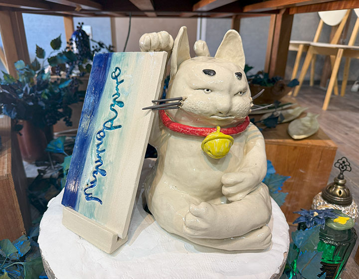 • 白いまねきねこと「Mizuma Azure」の陶器の看板。芸術祭のための特別な作品です。