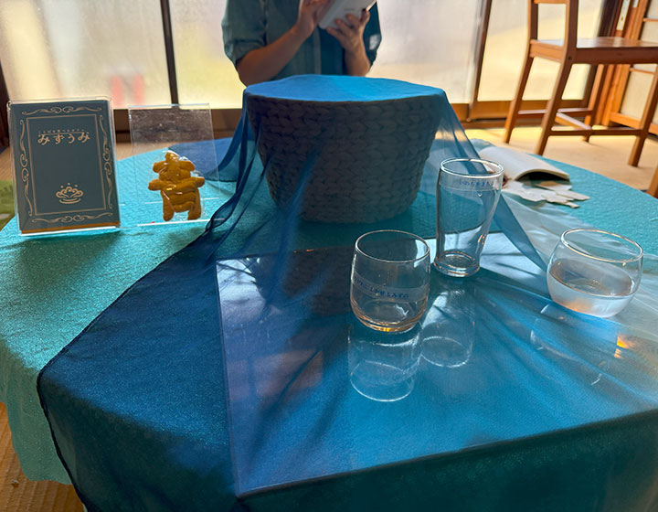 1階では「カフェみずうま」が開店。近木川源流でくみ上げた水に映るもう一人の自分と共に、自分の中に眠るキーワードを見つけてもらい、命に欠かせない「水」と共に飲み込むという特別な体験です。