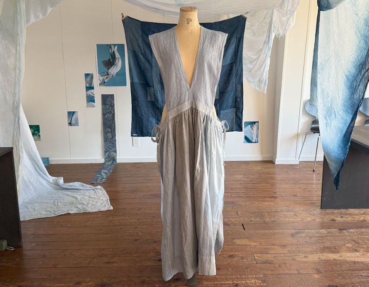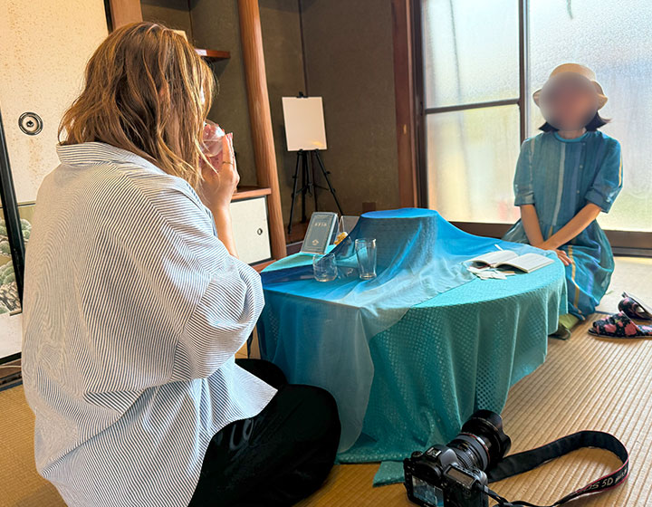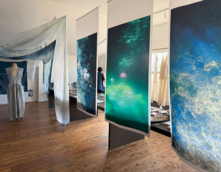 歴史ある建物の、太陽の光がたくさん差し込む空間を使い、「時と手をかけてうつす」営みを通して、この場所でしか生まれない「青」が表現されています。
