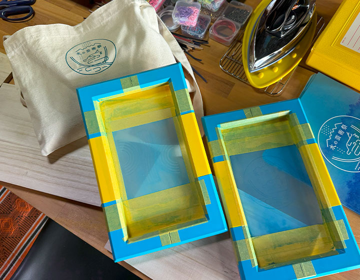 その他にも、水の芸術祭のロゴを布物に印刷する「シルクスクリーン」の体験も開催されています。