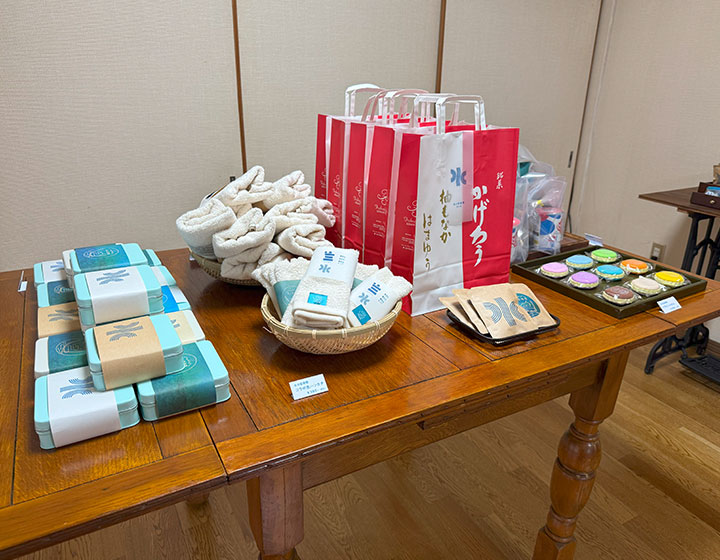 • 総合インフォメーション1階では、水の芸術祭オリジナルグッズやクッキー缶などのお土産を販売しています。