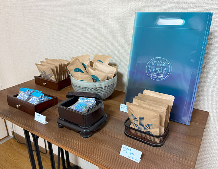 • 水の芸術祭オリジナルグッズ。ロゴを使ったステッカーや、お土産にピッタリのドリップ珈琲もおすすめ。