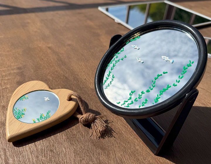 体験は、沢山の鏡の中から好きなものを選び、マーカーペンで好きなものを描き、空を映して写真を撮るという内容。